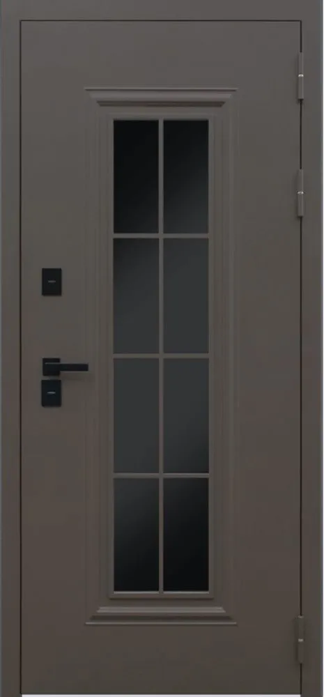 Два слоя покрытия: первый слой - цинкогрунт, второй слой - порошковое покрытие (цвет "муар коричневый"). Декоративный штамп на металле. Порошковое покрытие. Английская решетка. Тонированный стеклопакет. Наличники гладкие