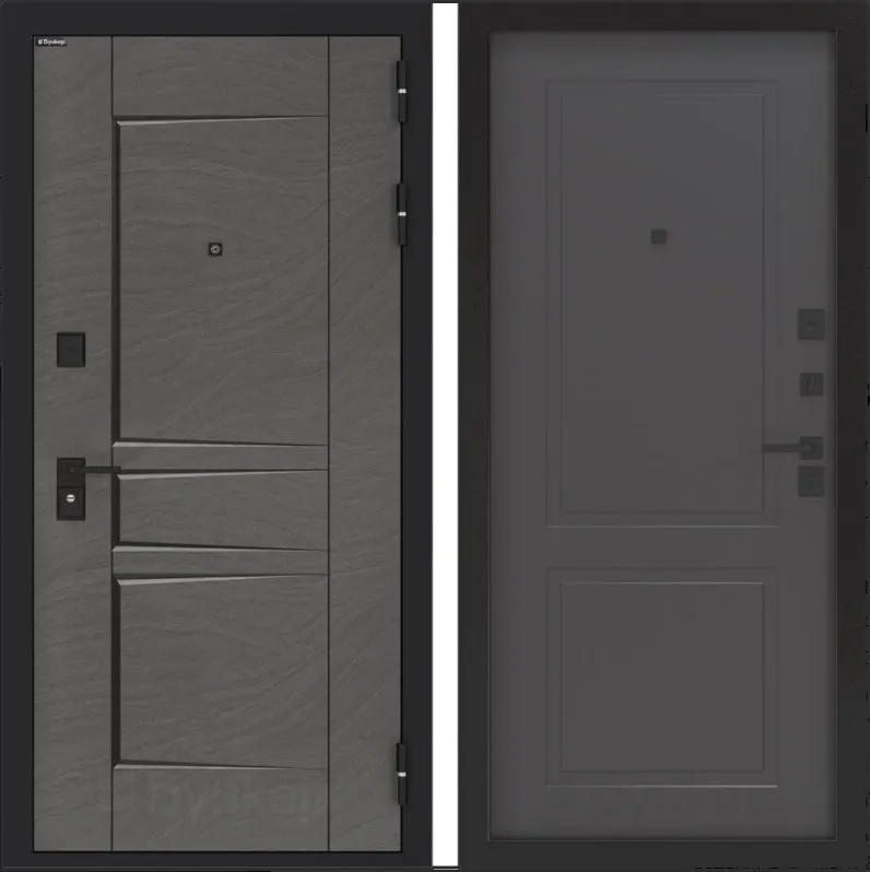 Черная матовая: Броненакладкая, сувальдные накладки со шторкой, ручка, ночник, цилиндр ключ-вертушка, глазок по центру или сбоку